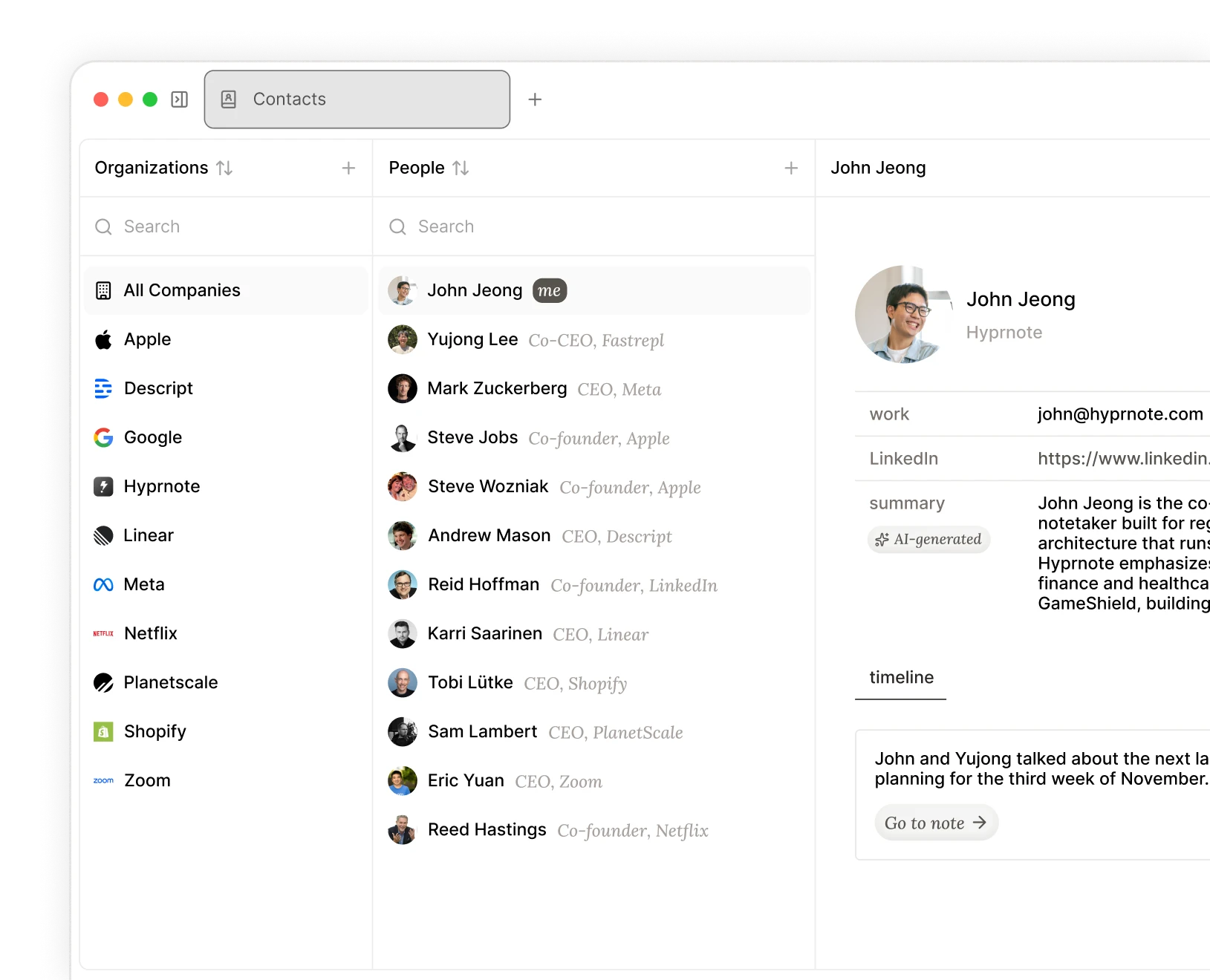 We believe in owning your data, doesn't matter where it lives. More important is what you bring from every meeting, every call, every chat.